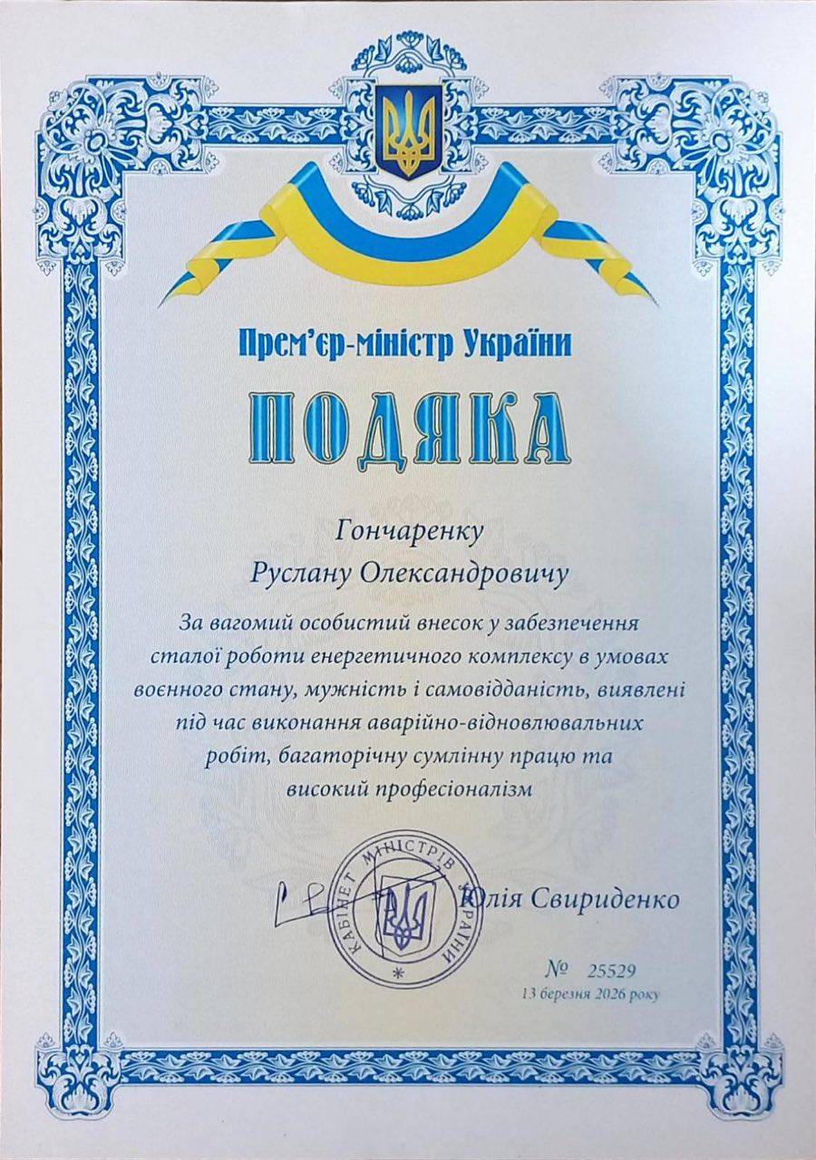 Руслан Гончаренко отримав Подяку за вагомий особистий внесок у забезпечення роботи енергетичного комплексу в умовах воєнного стану, мужність і самовідданість під час аварійно-відновлювальних робіт, багаторічну сумлінну працю та високий професіоналізм.