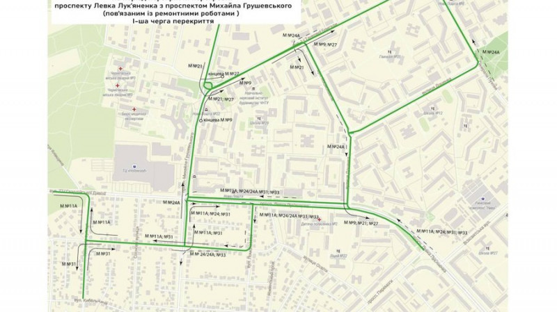 У Чернігові через ремонт на перехресті проспектів Левка Лук'яненка та Михайла Грушевського внесли додаткові зміни в рух громадського транспорту. Зокрема, вони стосуються об'їзду перекритої ділянки. Йдеться про тролейбусний маршрут №11А (замість тролейбуса зараз цей маршрут обслуговує автобус, — ред.) та автобусні маршрути №№ 24, 24А, 31 й 33.