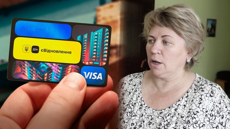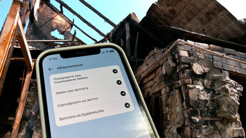 Колаж, на якому зображений додаток «Дія» в смартфоні та зруйнований будинок. Суспільне Чернігів