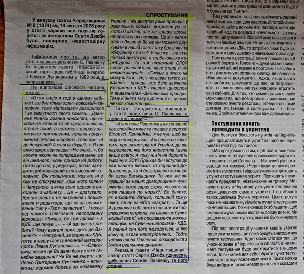 Лише частину вигадок сам Дзюба спростовує у газеті «Чернігівщина: події і факти» № 9 (1075) від 26 лютого 2026 року після позовної заяви Сергія Павленка на адресу редакції з конкретною вказівкою вигадок і неправдивої інформації. Проте своїх вигадок щодо В.Чепурного С.Дзюба так і не спростував.