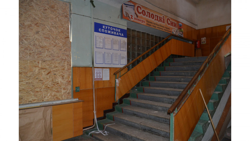 26 березня опівдні жінка розказує, як тиждень до того вночі почула вибухи, зник зв’язок та інтернет. Тож про обстріл універмагу, де вона працювала 40 років, дізналася зранку від доньки. Товар дивом уцілів. А ось приміщенню добряче дісталося: вікна та частина даху знищені.
