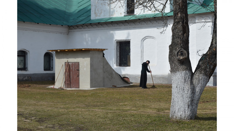 "За рік маємо 70 тисяч відвідувачів наших сторінок", — ділиться Олена, проводячи екскурсію територією монастиря. Біля храму працюють монахи: згрібають листя та впорядковують газон. На доріжці лежить місцевий улюбленець — пес Бася. Він супроводжує і монахів, і музейників.