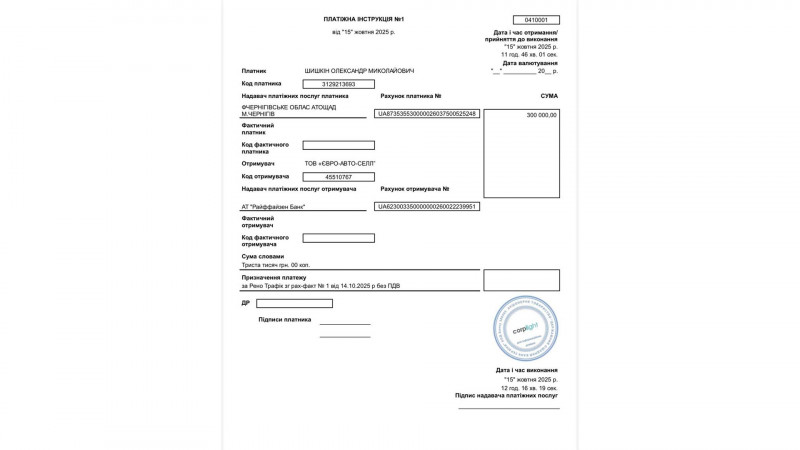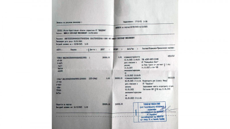 Також серед заявників подружжя Шишкіних — Олександр та Віталія. Вони повідомили, що в жовтні 2025 року перерахували компанії 300 тисяч гривень грантових коштів, отриманих від держави на купівлю мікроавтобуса Renault Trafic. Утім, його вони не отримали.