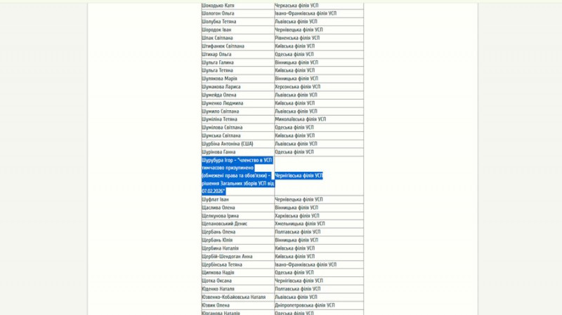 Психолог Ігор Шурубура вступив до УСП в 2021 році. На їхньому сайті йдеться про 27 членів спілки з Чернігівської області. Єдиний, кому призупинили членство у спілці, — Шурубура.
