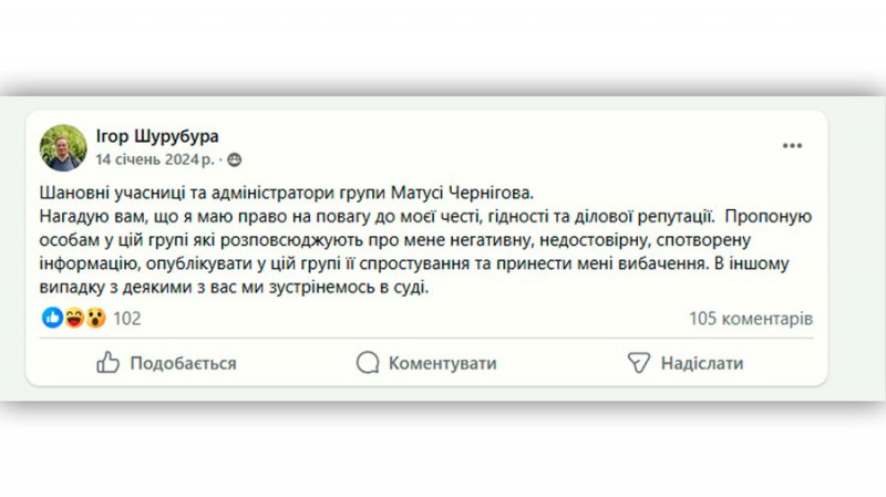 Анастасія Коломієць каже, що багато коментарів люди видалили через погрози Шурубури подати до суду за наклеп проти нього. І він подав позов проти Анастасії у жовтні 2024 року до Новозаводського районного суду, ідеться в постанові на сайті Єдиного державного реєстру судових рішень.