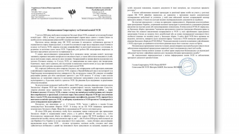 Повідомлення Секретаріату та Етичної комісії УСП щодо тимчасового припинення членства в УСП психологу. Українська спілка психотерапевтів