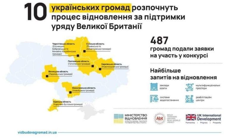 Три громади з Чернігівської області – в десятці відібраних по Україні, які візьмуть участь у проєкті «Ukraine Early Recovery» («Раннє відновлення України»). Йдеться про Сосницьку, Бобровицьку та Михайло-Коцюбинську громади.