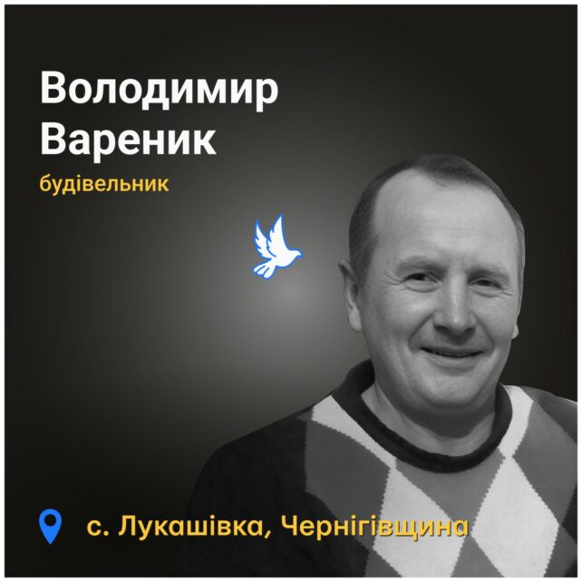 64-річний Володимир Вареник загинув 10 березня 2022 року в селі Лукашівка на Чернігівщині. Того дня були сильні обстріли. Уся родина сховалася у погребі, але туди потрапив уламок і спричинив пожежу.
