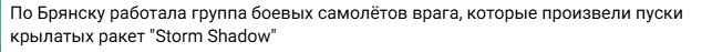 Інші пропагандистські пабілки повідомляють про авіаційний удар ракетами «Storm Shadow».