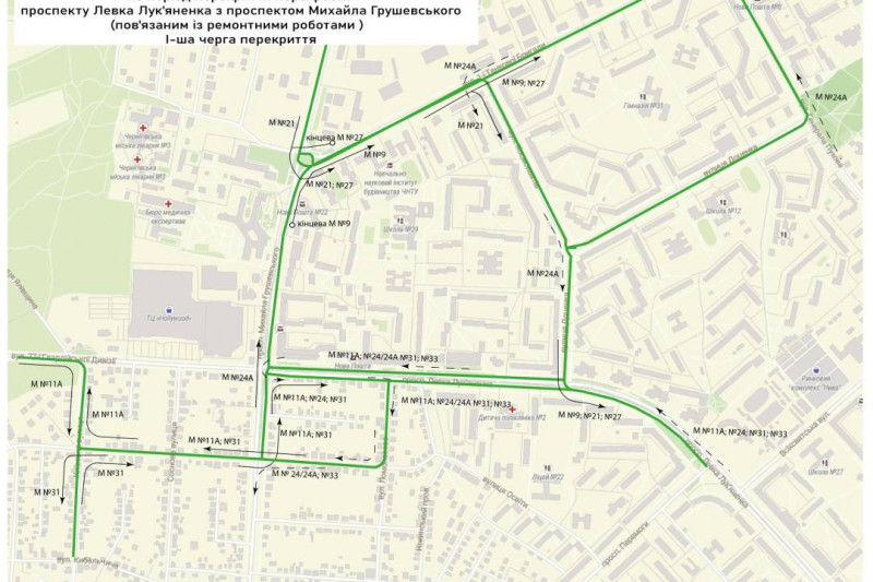 Відбулися зміни в деяких маршрутах щодо об’їзду перекритої ділянки дороги на перехресті проспектів Левка Лук’яненка та Михайла Грушевського. А саме: