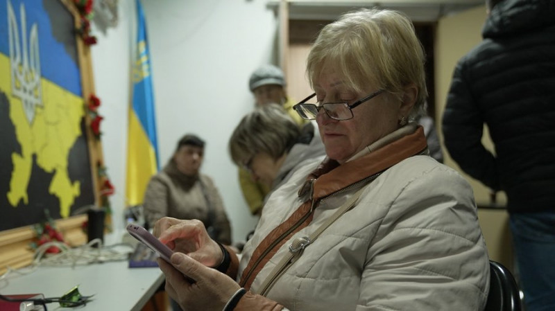 В одному зі стаціонарних пунктів незламності міста люди заряджають телефони. Начальниця відділу культури міськради Ніна Баришевська говорить: