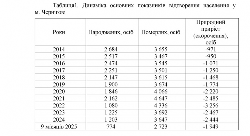 За січень – вересень 2025 року в Чернігові народилися 774 дитини, тоді як померли 2 723 людини. Природне скорочення становило 1 949 осіб.