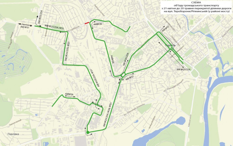Від 21 квітня до 20 травня буде перекрито рух транспорту по вулицях Тероборони та Ріпкинській у районі мосту через проведення аварійно-відновлювальних робіт на водопроводі, що проходить по центру проїзної частини. У зв’язку з ремонтом унеможливиться рух транспорту.