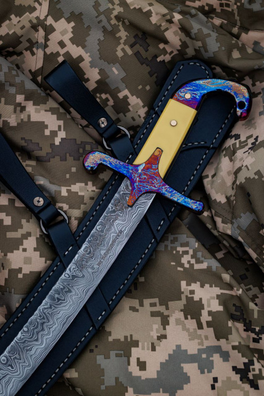 Унікальність її в тому, що клинок містить уламок російської ракети, а руків’я — частину рами ворожого FPV-дрона. Російські ворожі цілі збили над Чернігівщиною українські захисники.