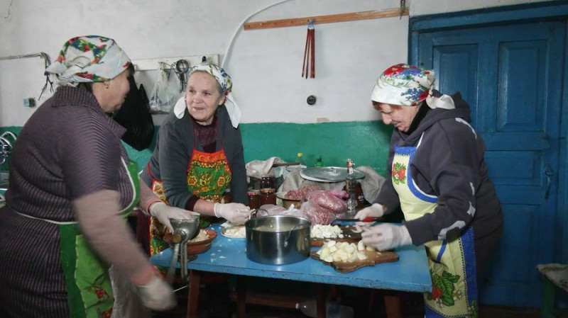 Жінки під час роботи. Суспільне Чернігів"Варення несем, он, своє. М’яса, дивіться, дівчата нанесли також свого, молоко теж, масло, он, теж. .. Багато чого ми приносимо з дому. Всі дівочки щедрі у нас. Дружні".