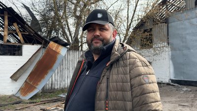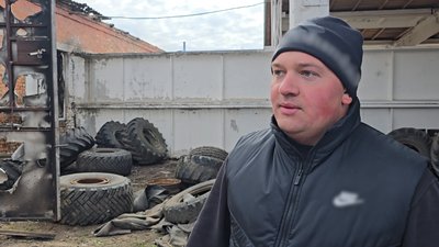 "Склад коліс був тут до імпортної техніки, багато коліс було. Машина “Волга” стояла. Обладнання там, станки були деякі. Насіння, я не знаю, що там із ним — треба дивитися, там трохи далі. Електроцех тут у нас був, двигуни різні зберігали, дроти. Тут стояв обприскувач, бензовоз, водовозка була, декілька тракторів було. Почали виганяти техніку з нього. Поки евакуювали машину УАЗ… Поки виганяли ту всю техніку… Ми виїхали на поле, витягували все. І якраз коли ми були на полі, у цей момент відбувся прильот. Коли ми сюди приїхали, ми вже побачили, що тут було полум'я, але ми не змогли його гасити, бо була небезпека повторного влучання. І поки ми чекали, то пожежа розвивалась, розвивалась. Як тільки змогли — то почали одразу гасити".