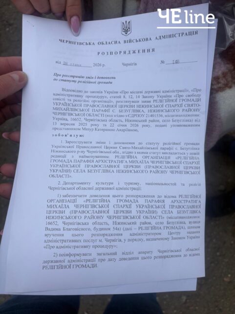 Рішення про зміну юрисдикції релігійної громади було ухвалене ще 13 вересня 2025 року під час зборів жителів села. Тоді сто мешканців підтримали перехід храму з упц (мп) до ПЦУ. Згодом, 28 січня 2026 року, Чернігівська обласна військова адміністрація офіційно затвердила перереєстрацію громади, після чого храм юридично перейшов до ПЦУ. Чернігівська єпархія також призначила нового священнослужителя.