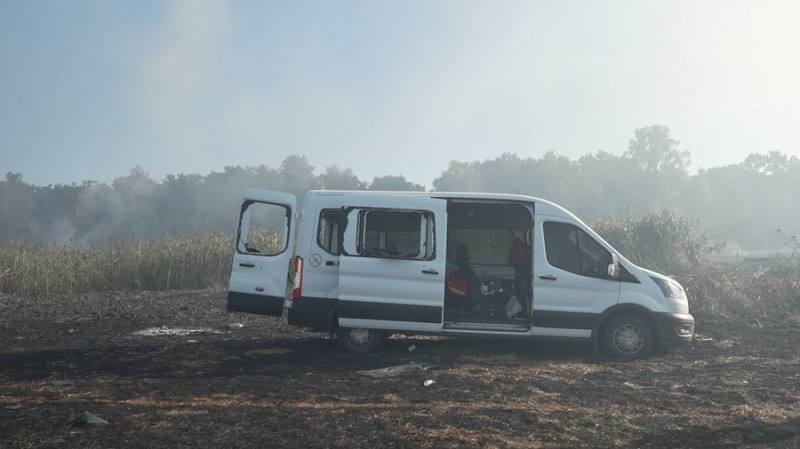 Пошкоджена автівка гуманітарної місії на місці прильоту в районі Новоселівки поблизу Чернігова 4 вересня 2025 року. Суспільне Чернігів