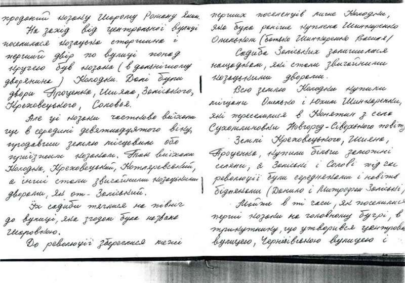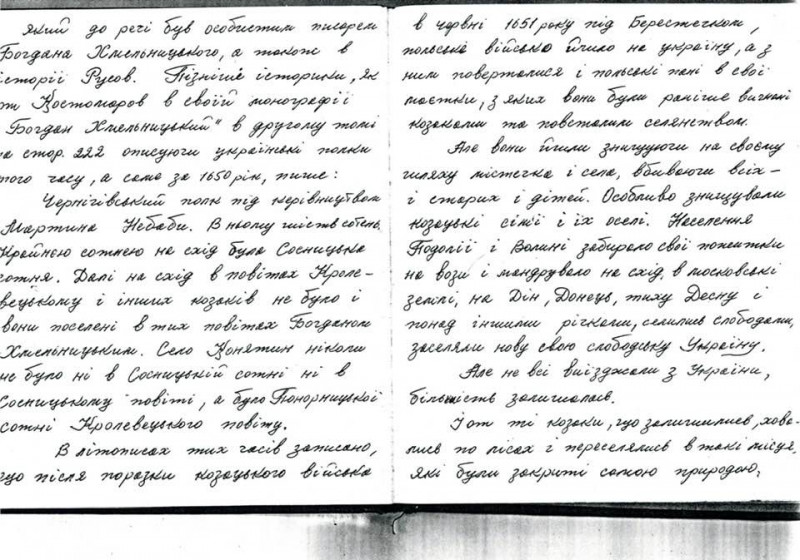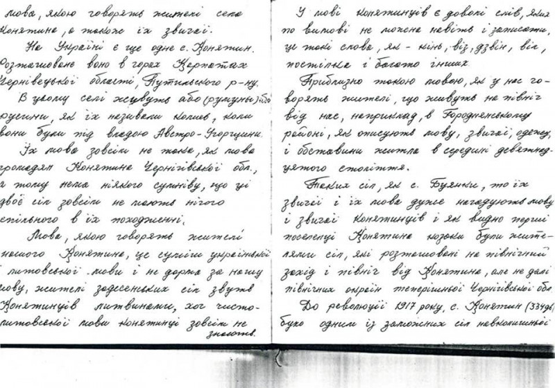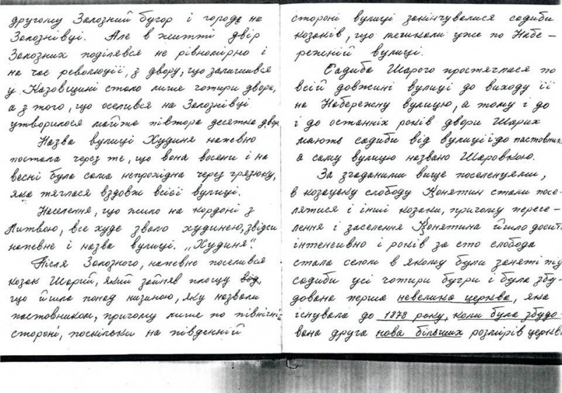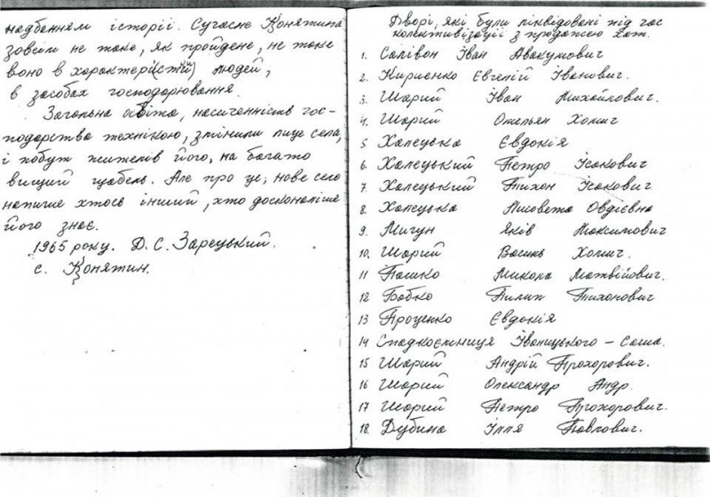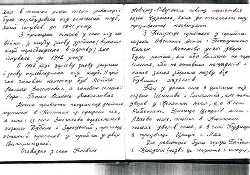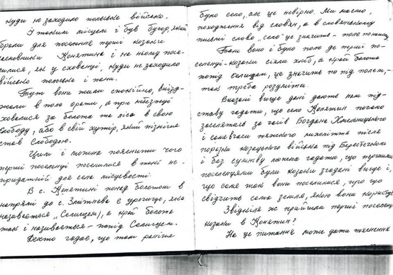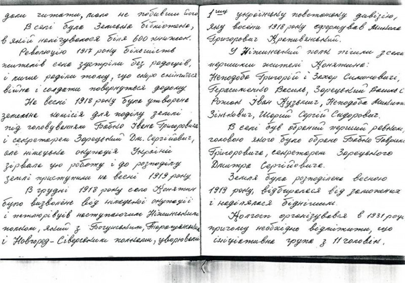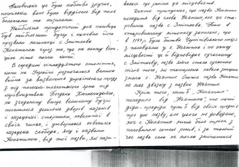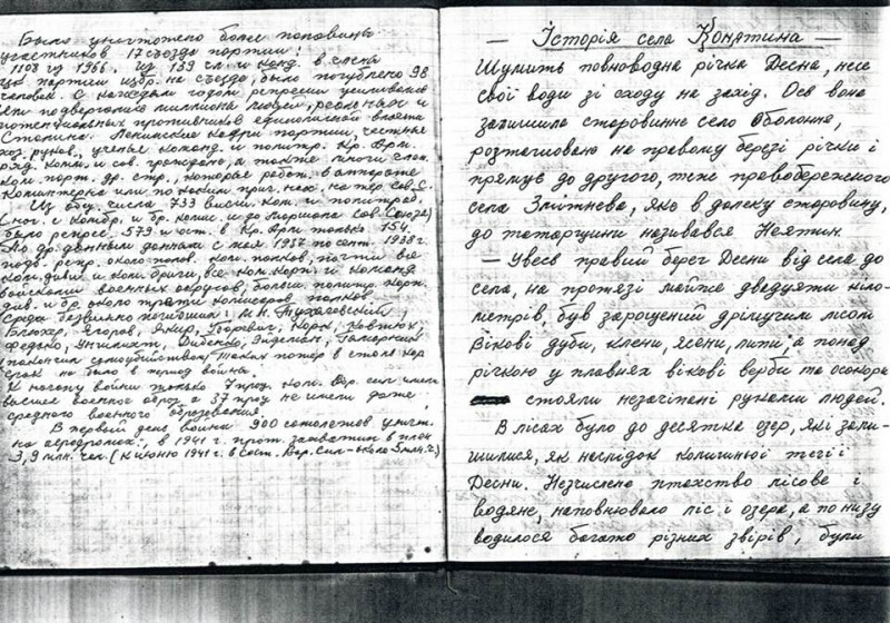 «Прізвище цього лікаря – Зарецький. Він захоплювався історією, краєзнавством, збирав факти, свідчення та різні документи – і ось написав таку крутезну історичну роботу. Це історія села з давніх часів, від його створення. Про те, як кілька сімей козаків, втікаючи від закріпачення, дісталися Чернігівщини, знайшли там потаємне місце, до якого важко було дістатися імператорським посіпакам. І заснували там хутори. І з цих хуторів утворилося село Конятин», – зазначила Наталія Чусь.