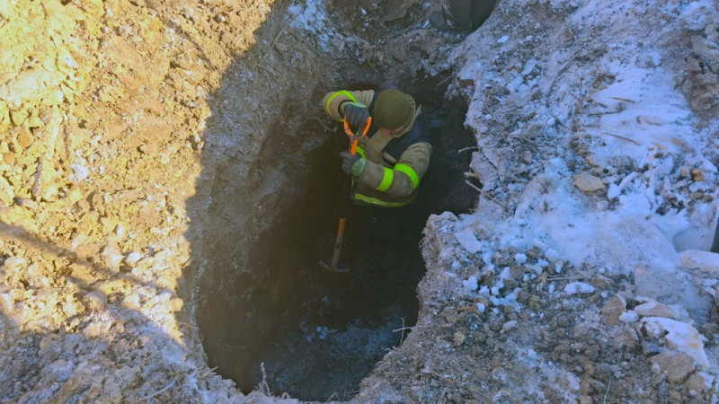Працівник вручну розкопує місце пориву на прикордонні Чернігівщини. Новгород-Сіверська громада