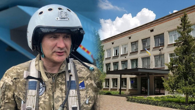 Колаж, на якому пілот Олександр Довгач та школа №29 у Чернігові, у якій він навчався. Командування Повітряних сил ЗСУ / Google Maps