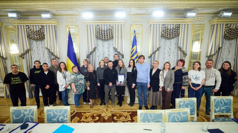 Володимир Зеленський разом з нагородженими волонтерами. Офіс президента України