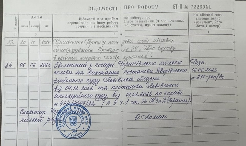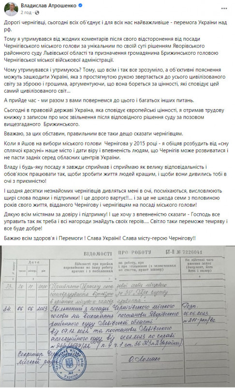Владислав Атрошенко на своїй сторінці у Фейсбук опублікував допис і фотографію буцімто сторінки з трудової книги. На фотографії чітко помітний запис – «Звільнений з посади Чернігівського міського голови на виконання постанови Яворівського районного суду Львівської області від 07.12.2022 та постанови Львівського апеляційного суду від 01.02.2023».